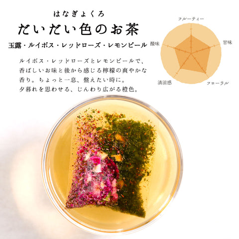 特に女性に人気のお味です。濃い夕焼けの様な、ノスタルジックなだいだい色のお茶。
